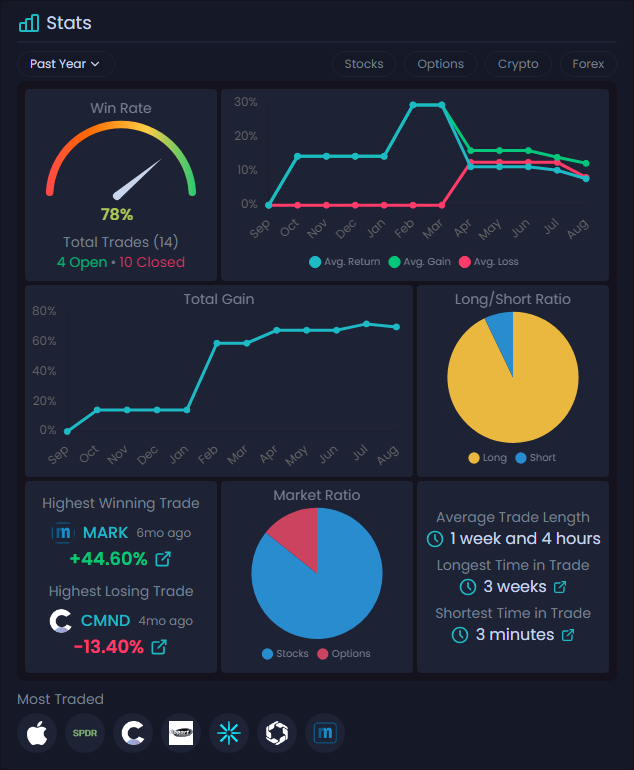 우리 플랫폼에서는 거래 신호를 자동으로 추적하는 디스코드 봇을 통해 각 트레이더의 승률, 평균 수익/손실, 총 수익, 롱/숏 비율 등 상세한 통계를 보여주는 대시보드를 만들어줍니다. 실시간 거래 알림, 자동화된 트레이딩 신호, 소셜 트레이드 공유 기능을 제공하고 있고, 현재 주식, 옵션, 암호화폐, 외환을 지원하며 곧 선물 거래도 추가할 예정이에요.