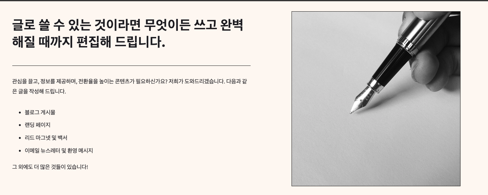 지금은 전략 컨설팅과 콘텐츠 제작 서비스를 제공하고 있어요. 블로그 포스트, 랜딩 페이지, 이메일 등을 작성하고 전체 콘텐츠 마케팅 전략을 관리하죠. 현재 월 매출은 약 1,960만원 정도이고, 추가 프로젝트를 진행할 경우 그 이상을 기록하기도 합니다.